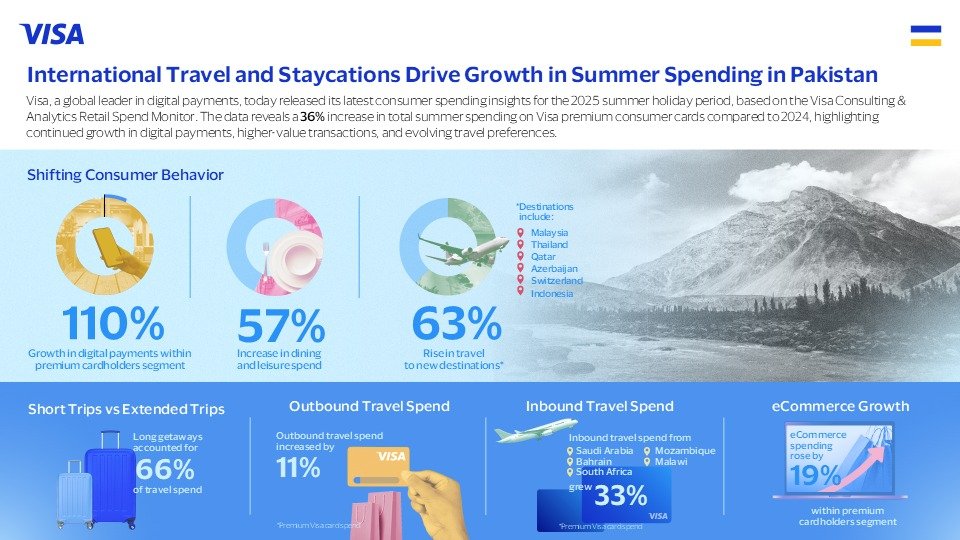 Karachi : Visa, a global leader in digital payments, its latest consumer spending insights for the 2025 summer holiday period in Pakistan, based on the Visa Consulting & Analytics Retail Spend Monitor. The data reveals a 36% increase in total summer spending on Visa premium consumer cards compared to 2024, highlighting continued growth in digital payments, higher-value transactions, and evolving travel preferences.