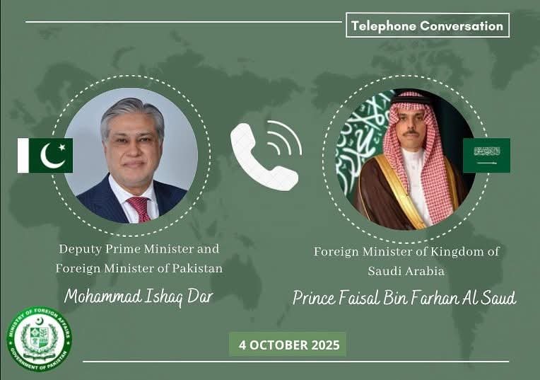 Islamabad : Deputy Prime Minister/Foreign Minister, Senator Mohammad Ishaq Dar, held a telephone conversation with His Highness Prince Faisal bin Farhan Al Saud, Foreign Minister of Saudi Arabia.