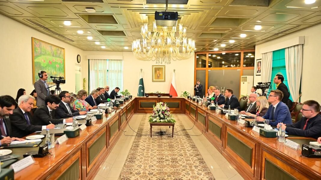 Islamabad : Deputy Prime Minister/Foreign Minister Senator Mohammad Ishaq Dar held delegation-level talks with his Polish counterpart Polish counterpart, Radoslaw Sikorski at the Ministry of Foreign Affairs. Both sides appreciated the positive trajectory of bilateral relations and agreed to enhance cooperation in trade, energy, defence, and education.