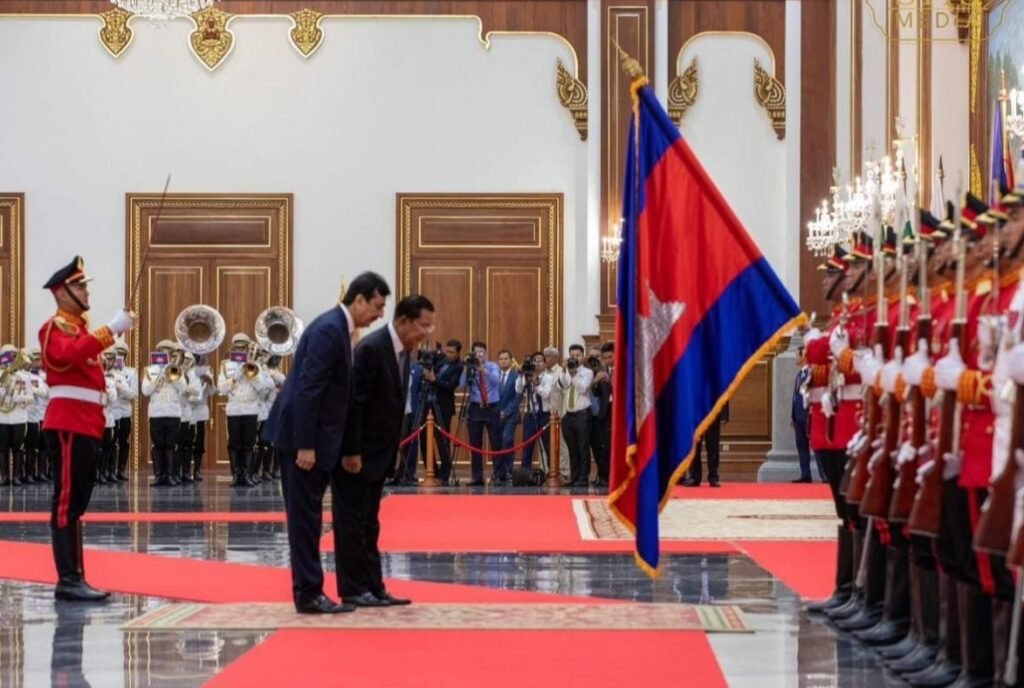 Subsequently, Chairman Senate arrived at the Solidarity Palace of the Cambodian Senate, where a dignified official reception ceremony was held in his honor at the Polyarthipadi Hall. The President of the Cambodian Senate, Samdech Akka Moha Sena Padei Techo Hun Sen, personally welcomed the Chairman Senate of Pakistan. Both leaders reviewed the Guard of Honour, followed by the introduction of delegation members and a formal exchange of greetings.