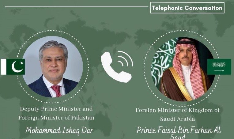 Islamabad :-  Deputy Prime Minister/Foreign Minister Mohammad Ishaq Dar held a telephonic conversation today with the Foreign Minister of Saudi Arabia, Faisal bin Farhan Al Saud.
