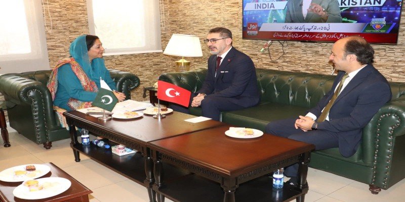 Islamabad : Ambassador of the Republic of Türkiye to Pakistan Irfan Neziroglu, accompanied by Ünal Eryilmaz, Director General for Foreign Affairs and EU Relations at the Ministry of National Education of Türkiye, and Mehmet Toyran, calls on Minister of State for Federal Education and Professional Training Wajiha Qamar in Islamabad.